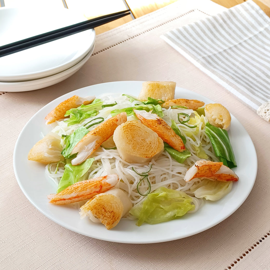 ほぼカニとほぼホタテをたっぷり使用した焼ビーフン!ホタテ風味のこく旨塩ソースとほぼホタテの組み合わせがよりホタテ感を楽しめる組み合わせに。休日や夏休みの昼...