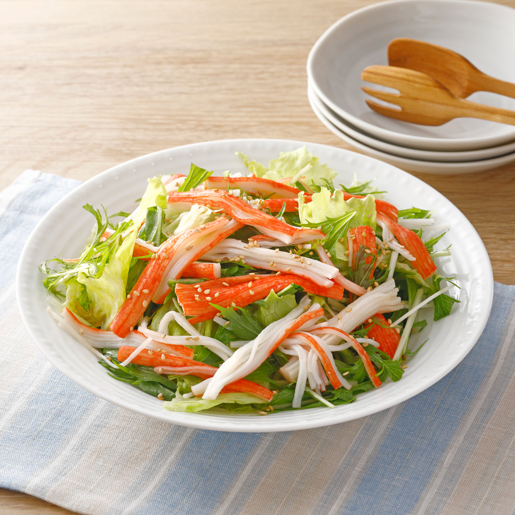 いつものカニかまより、ジューシーでリッチなおいしさ。焼きガニ風味やほぐれ感がサラダにピッタリです!